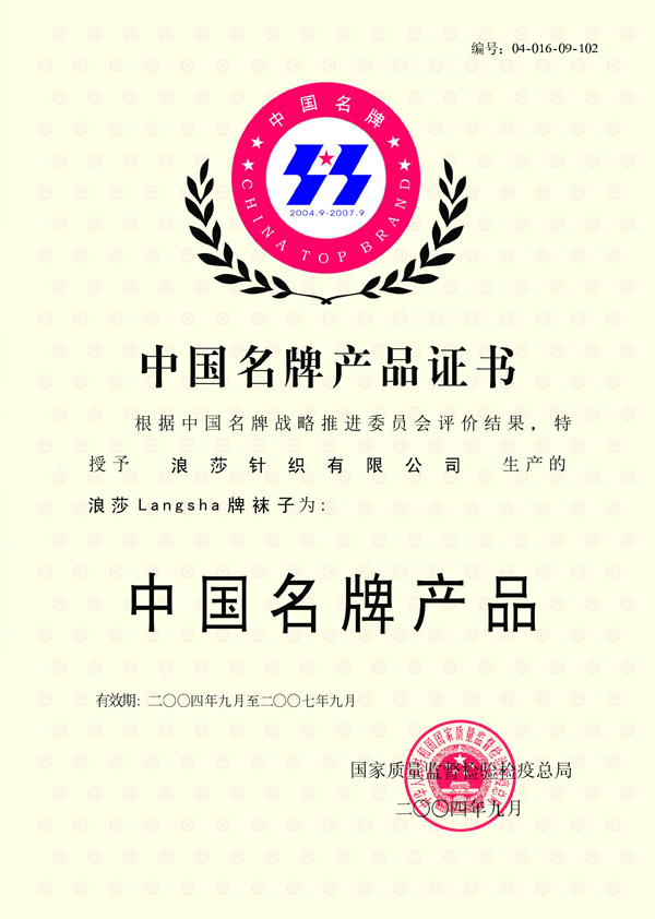 中國名牌子產品證書